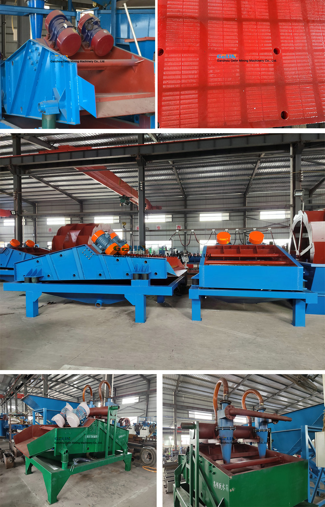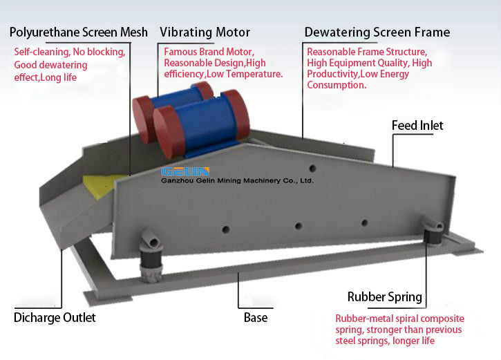 Dewatering screen is driven by two vibrating motors, which makes the screen sieve move to-and-fro online to achieve the filtering purpose.With the vibration of the screen, the concentrated tailings materials are continuously thrown up and down on the screen, the materials are loosened and crashed to the sieve, the small size materials are filtered away from the sieve holes. Finally, it reaches the aim of classifying, dehydrating and desliming.